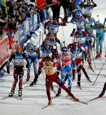 Участники стартуют в таком порядке и с такими интервалами, с какими они финишировали в спринте. Длина дистанции — 12,5 километров у мужчин и 10 километров у женщин. Спортсмены проходят четыре огневых рубежа, места на которых они занимают в соответствии с порядком прихода на стрельбище. Стрельба осуществляется из положений лежа, лежа, стоя, стоя. Промахи наказываются 150–метровыми штрафными кругами.