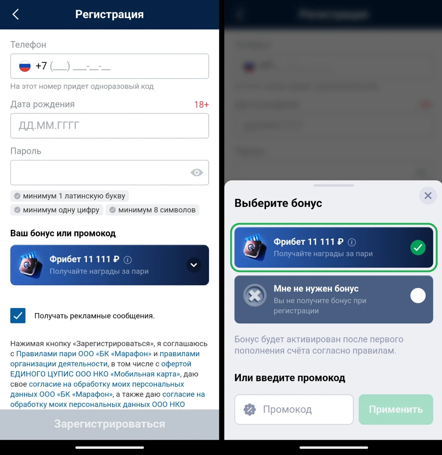 Акция «Фрибет 11 111 рублей» действует для всех новых пользователей, которые прошли регистрацию на сайте или в мобильном приложении «Марафон» и выбрали именно этот бонус в соответствующей форме. Далее необходимо выполнить следующие действия: