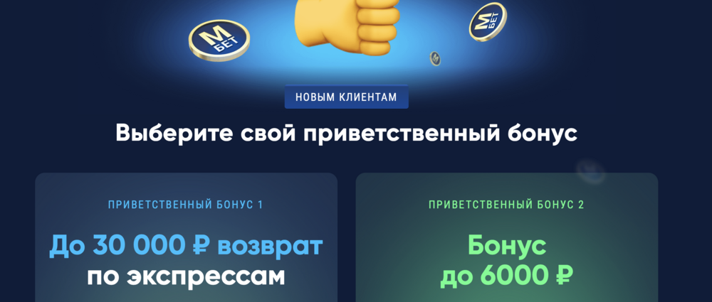 За регистрацию аккаунта предусмотрен бонус. Игроки могут выбрать возврат по экспрессам до 30 000 рублей или до 6 000 рублей на бонусный баланс. При первом пополнении счета можно использовать только один из представленных бонусов.