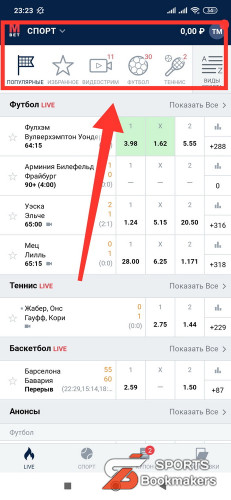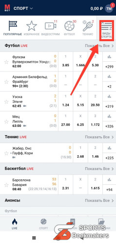- На главной странице экрана нажмите на вкладку «Виды спорта»;