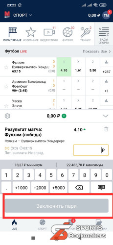 - Введите сумму и нажмите на кнопку «Заключить пари».